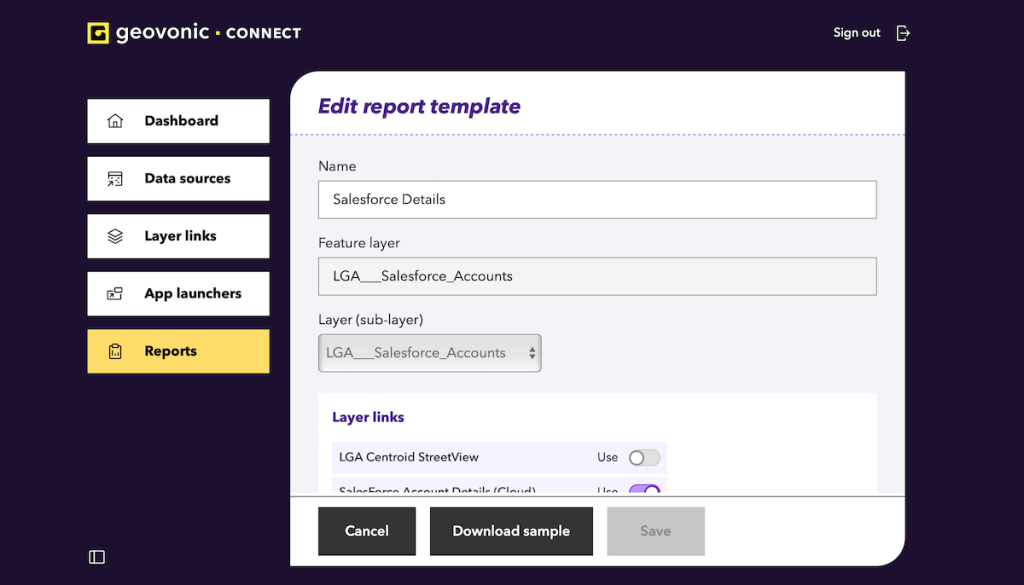 (You do not need any layer links to use Geovonic Connect reporting. If you want, you can generate reports based only on feature attribute values.) - You can now download a sample report template. This sample is a handy starting point for creating your MS Word template. It contains examples of all available fields that you can use in your report both from the map feature and the layer links.